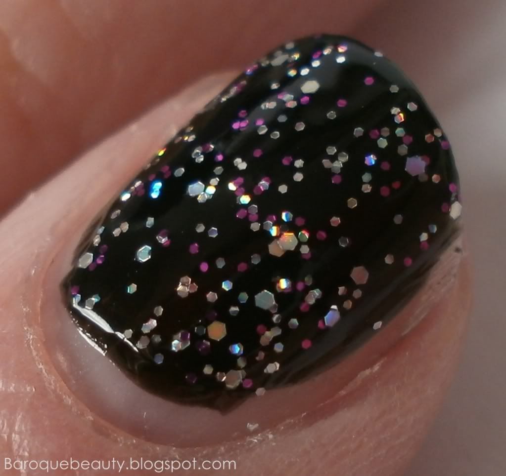 Dan eentje die behoord tot de nieuwere collectie: It's Purplicious. Kleine paarse glittertjes met daartussen zilveren holografische.