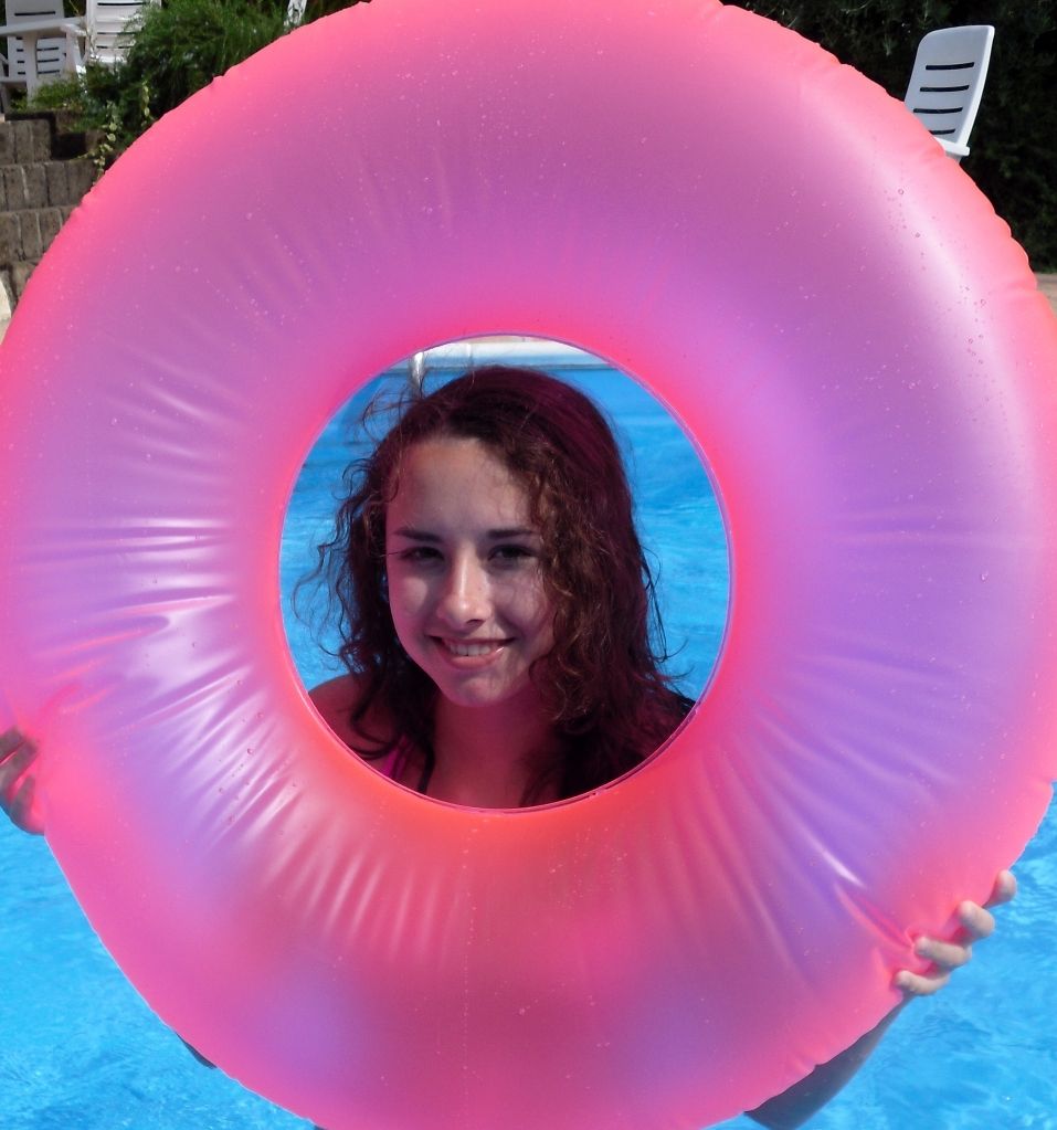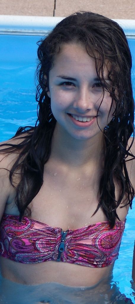 Na de spullen opgeruimd te hebben sprongen m'n zusje in het zwembad. *Plons!*
