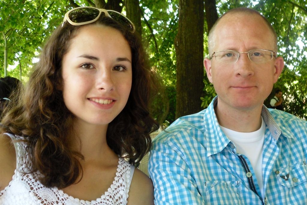 Met papa bij een prachtig restaurant, recht naast de rivier.