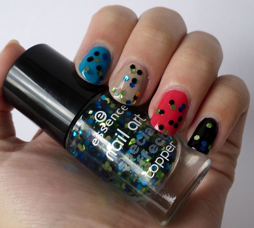 Mr and Mrs Glitter - Een topcoat met erg grove hexagon glitters. Een ramp om gelijk aan te brengen helaas, maar wel een redelijk leuk effect.