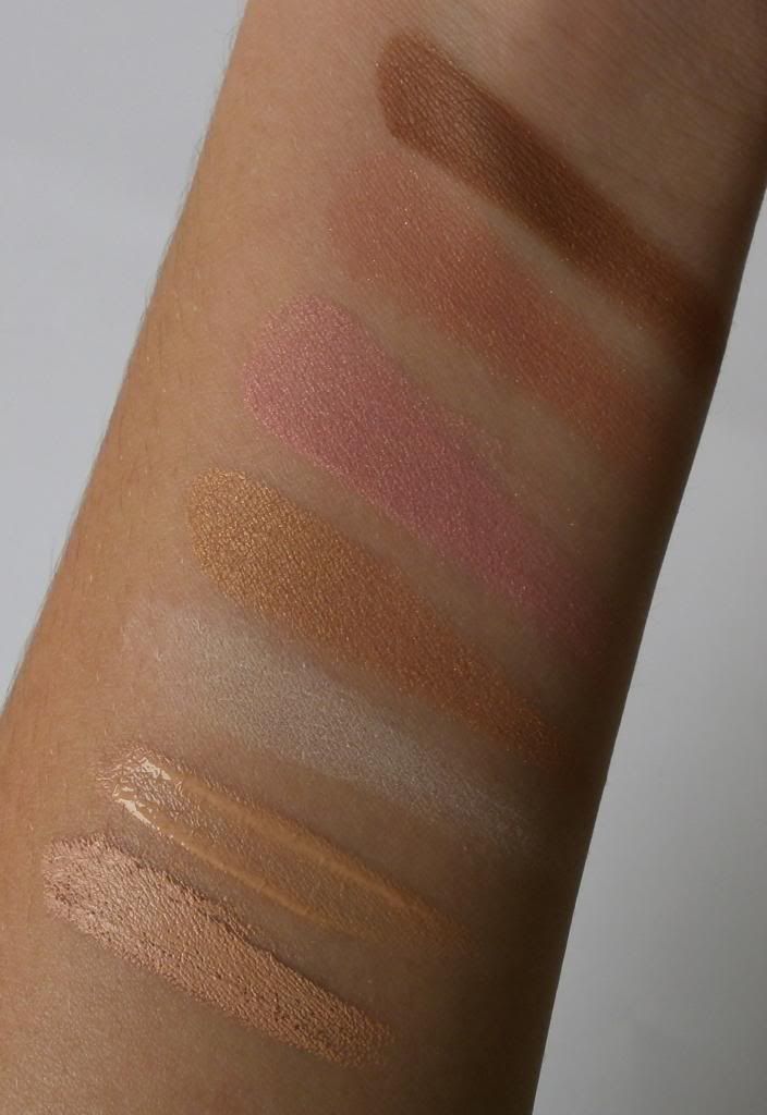 Van boven naar beneden: Blush & bronzer duo, blush in Twinkle Pink, bronzer in Sun Kissed, Tone Correcting Powder (wordt doorzichtig als je 'm uitveegt), de vloeibare concealer in Leigt Beige en de concealer stick in Honey.